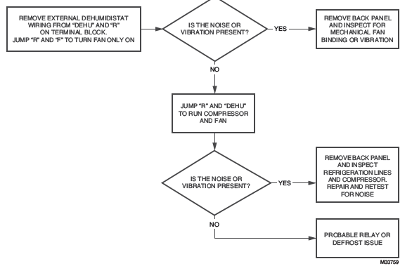 | Fan runs when there is a call for dehumidification and the ventilation control is OFF, but the compressor cycles on and off too frequently. | 1. Low ambient temperature and/or humidity causing unit to cycle through defrost mode. 2. Defective compressor overload. 3. Defective compressor. 4. Defrost thermostat defective. 5. Dirty air filter(s) or airflow restricted. 6. Low refrigerant charge, causing defrost control to cycle. 7. Bad connection in compressor circuit. Fan does not run with fan switch in either position |