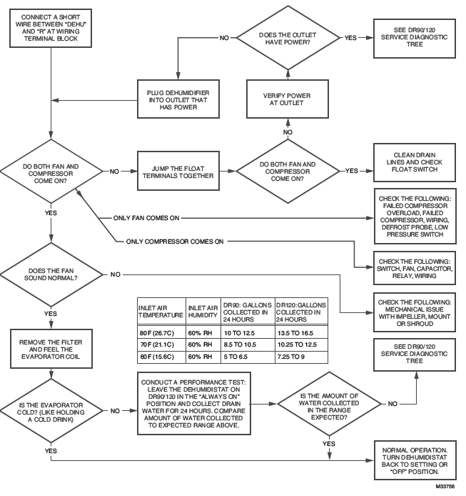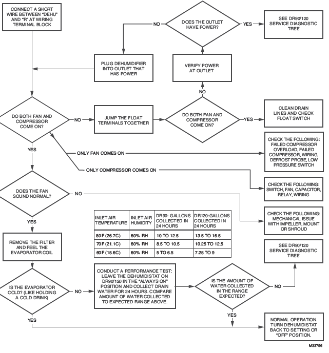 Apply power to DR90A3000/DR120A3000. Turn the humidity control to a low RH% level to initiate a dehumidification call. Confirm that the DR90A3000/DR120A3000 compressor and fan turn on. If the RF and GF on the DR90A3000/DR120A3000 is wired to the furnace, the furnace fan should also run. This will take up to two minutes. Be sure to turn the control to the desired RH% or to Off when checkout is complete. Clean Filters, and make sure drains are clear and free of debris or sludge. |