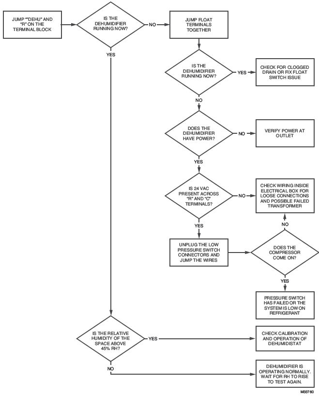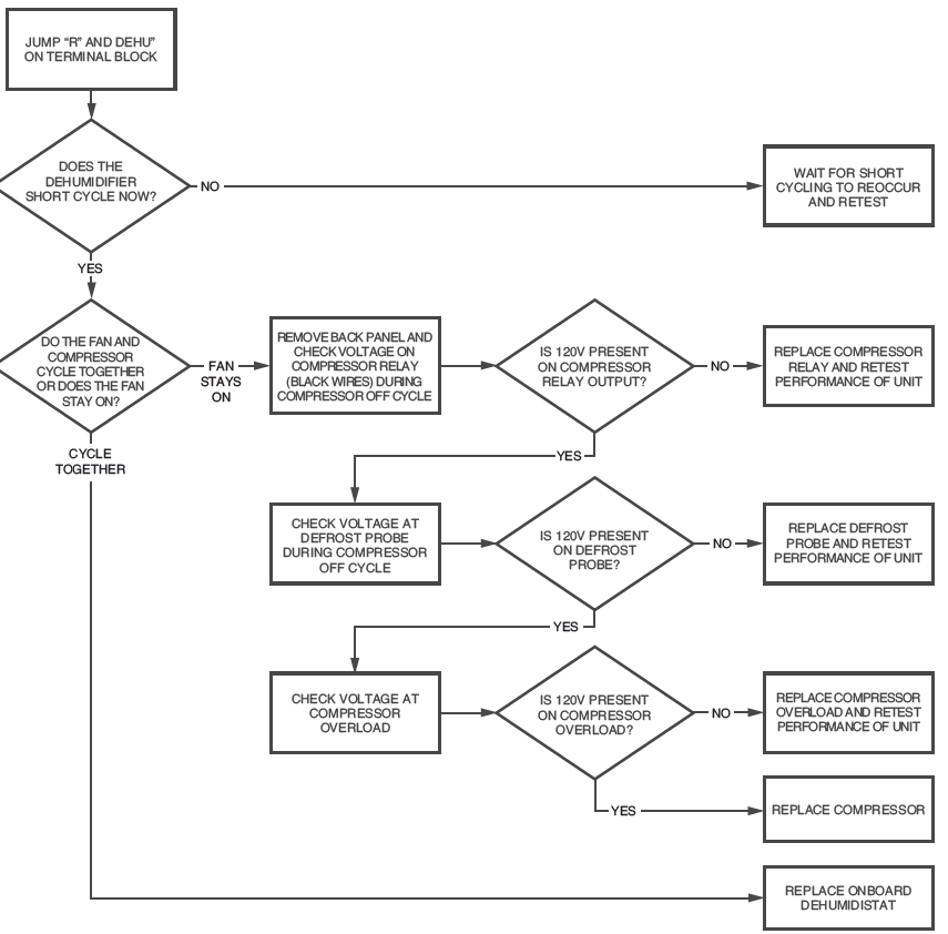 | 4. If the unit still does not run within 5 minutes of installing a jumper from R to DEHUM, verify voltage to the outlet that the dehumidifier is plugged into. This should be 120 VAC nominal and if it drops below 102 VAC or above 132 VAC, the dehumidifier will not run. | ||||||||||||||||||||||||||||||||||||||||||||||||||||||||||||||||||||||||||||