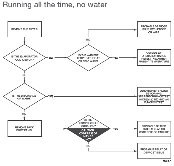 | Unit removes some water, but not as much as expected. | 1. Air temperature and/or humidity have dropped. 2. Humidity meter and or thermometer used are out of calibration. 3. Unit has entered defrost cycle. 4. Dirty air filter. 5. Defective defrost thermostat. 6. Low refrigerant charge. 7. Air leak such as loose cover or ducting leaks. 8. Defective compressor. 9. Restrictive ducting. 10. Optional Condensate Pump Safety Switch open. |