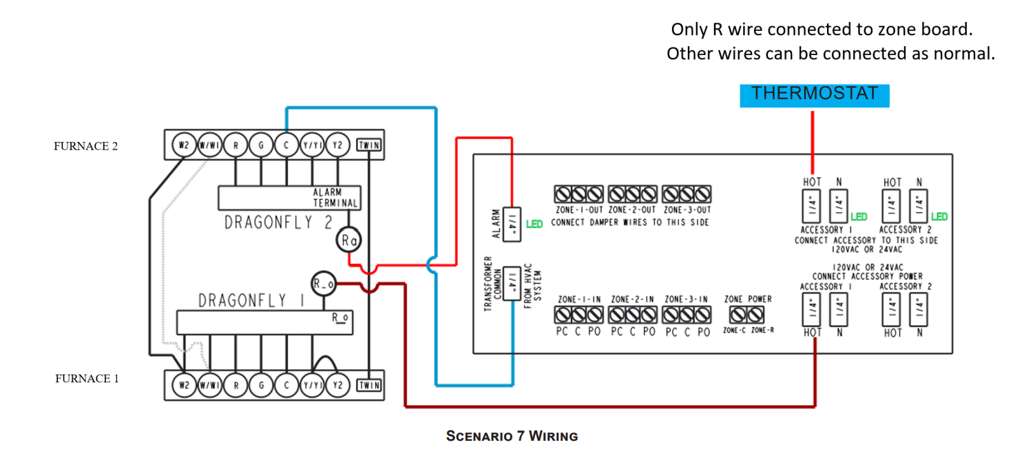 Furnace 1 (powers the thermostat): Ro Terminal from Furnace Integration Kit control board 1 is wired through the accessory relay on the zone/accessory board to the thermostat.