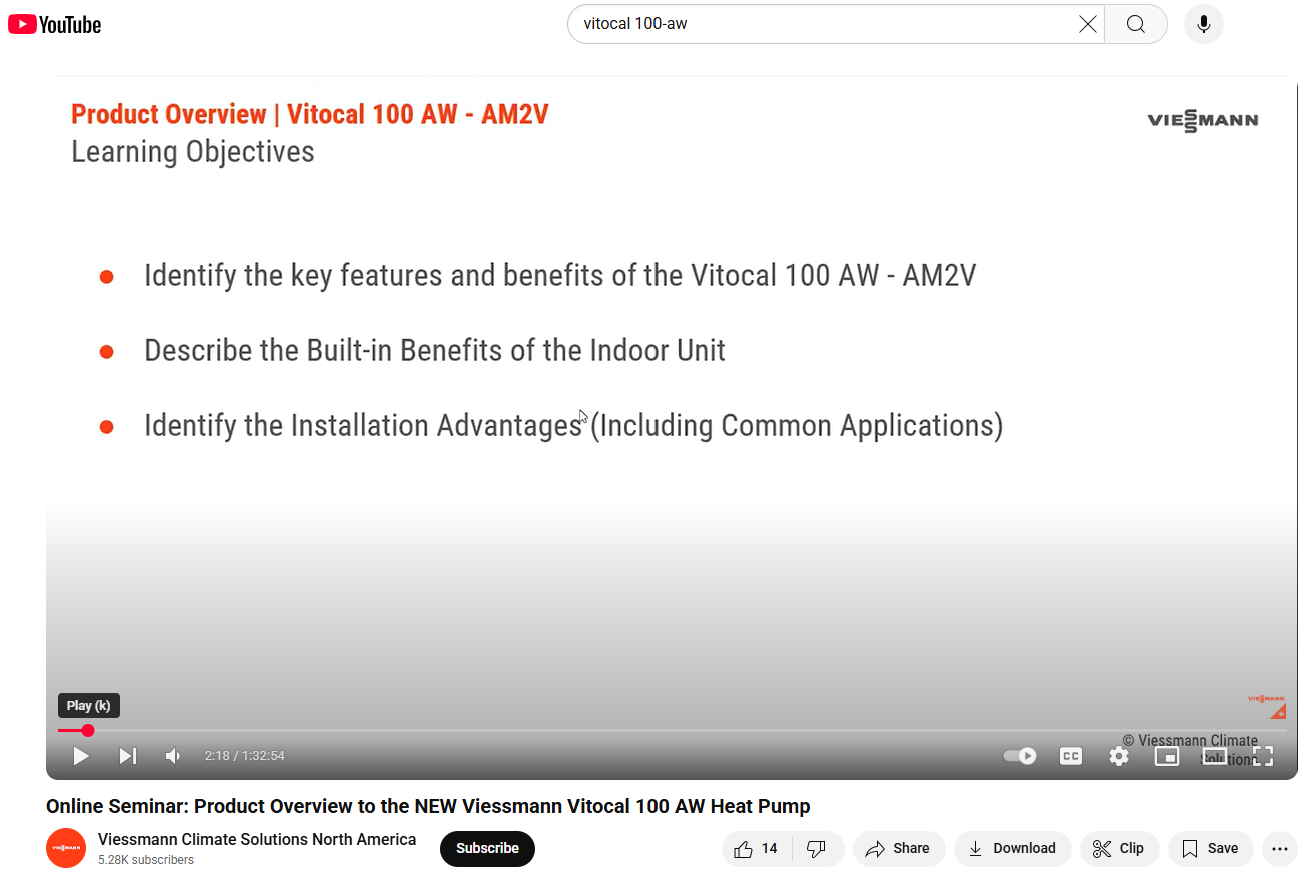 Vitocal 100-AW product introduction training video Matt Clelland Apr 15, 2025 25 This is the link to the product introduction video: Vitocal product overview Vitocal wiring video